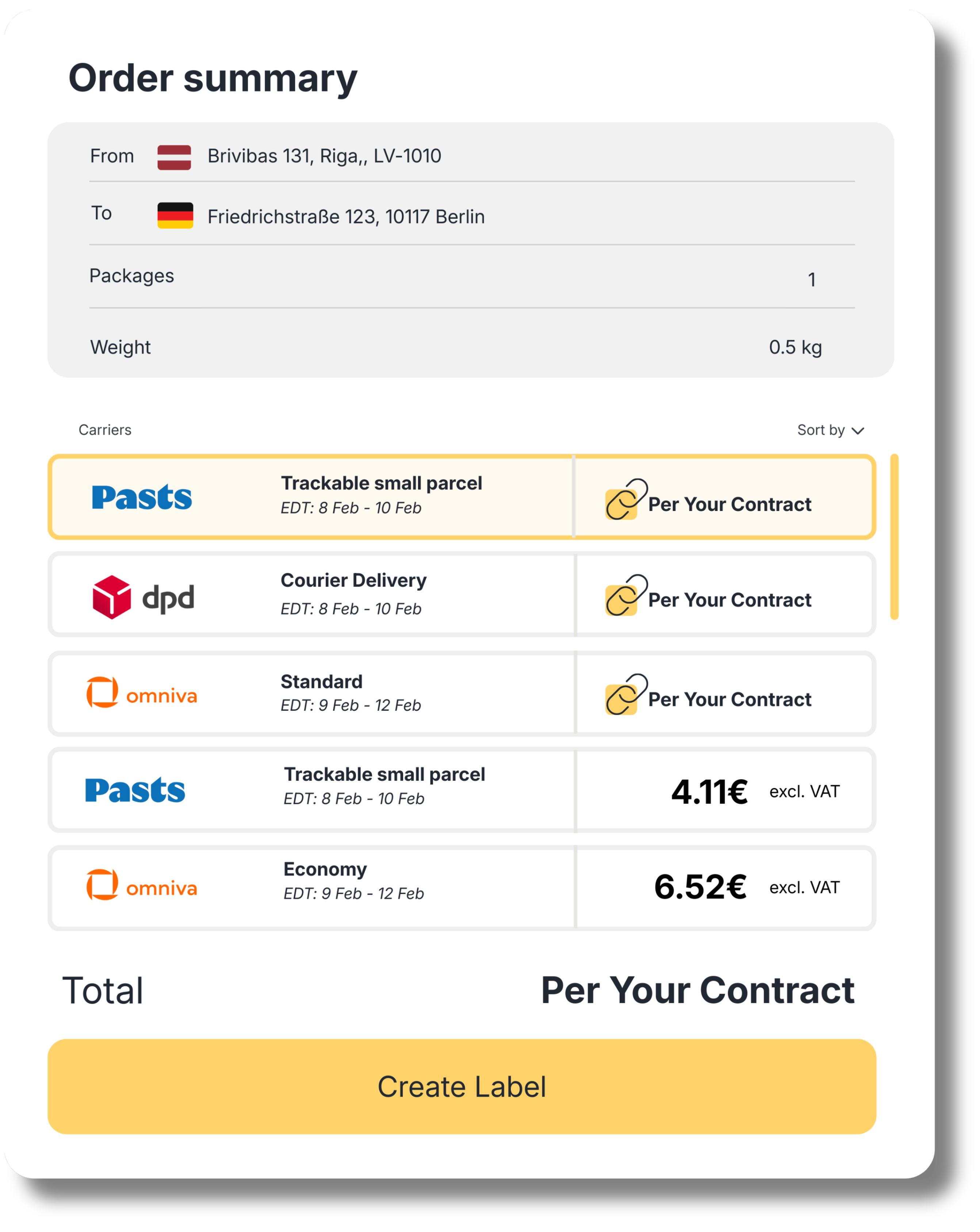 Connect your own carrier contracts and use them across the full Swotzy workflow, with no feature limitations or reduced functionality — €0.12 per shipped label.