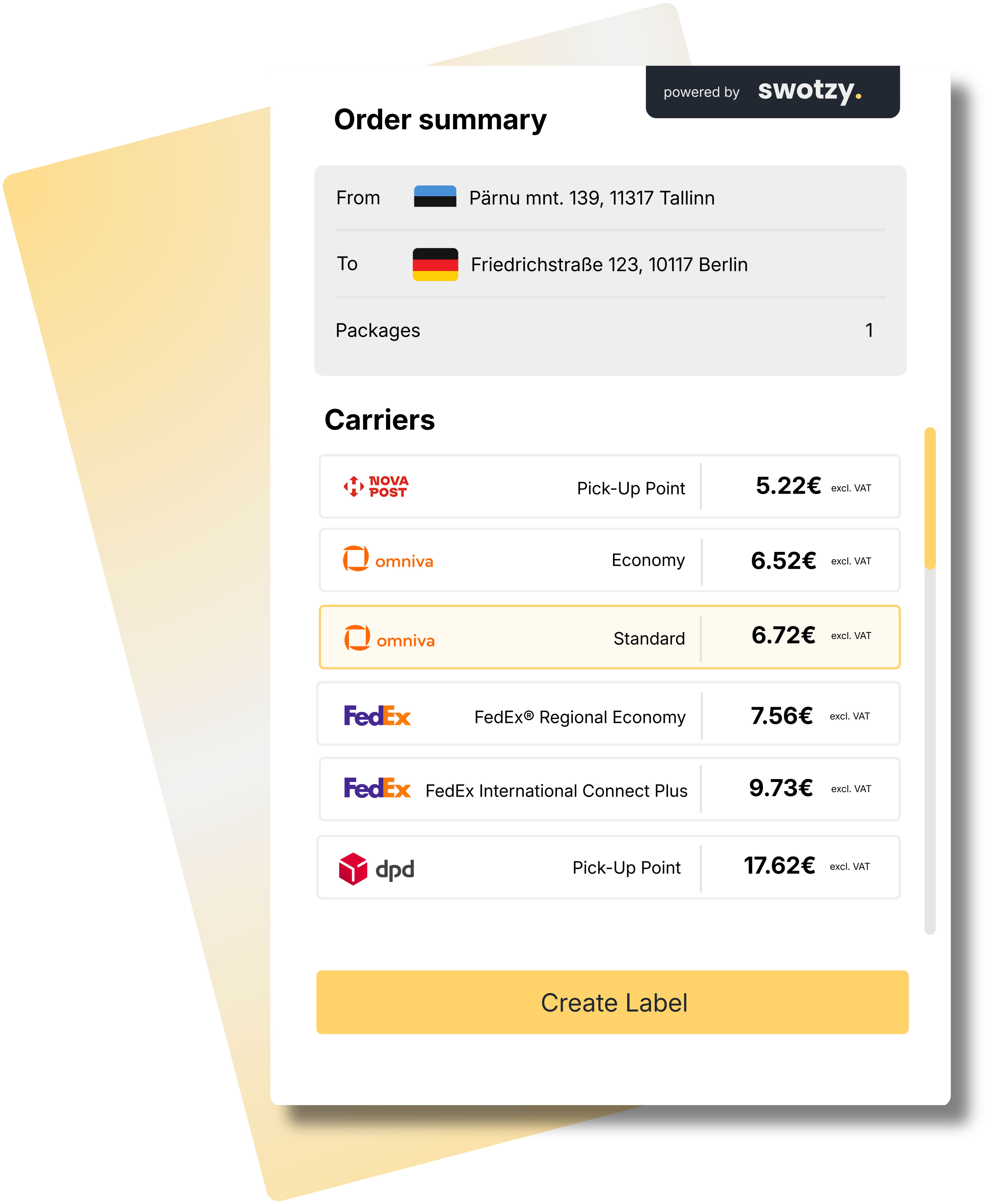 Olenemata sellest, kas sinu kliendid valivad pakiautomaadi või asuvad teisel pool maailma, pakub Swotzy soodsamaid saatmishindu igasse sihtkohta. Võrdle juhtivate kullerite pakkumisi ühel platvormil ja saada kuluefektiivsemalt.