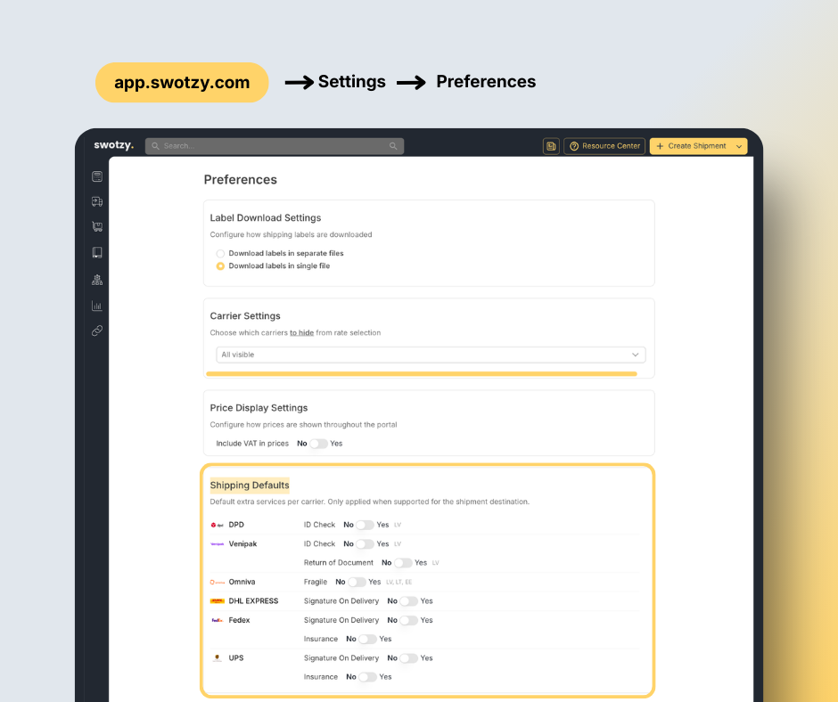 You can now define default extra services per carrier in your account preferences. If a carrier supports additional services such as Signature on Delivery, Insurance, Fragile, or others, you can set them as defaults so they are automatically applied when creating shipments for supported destinations.