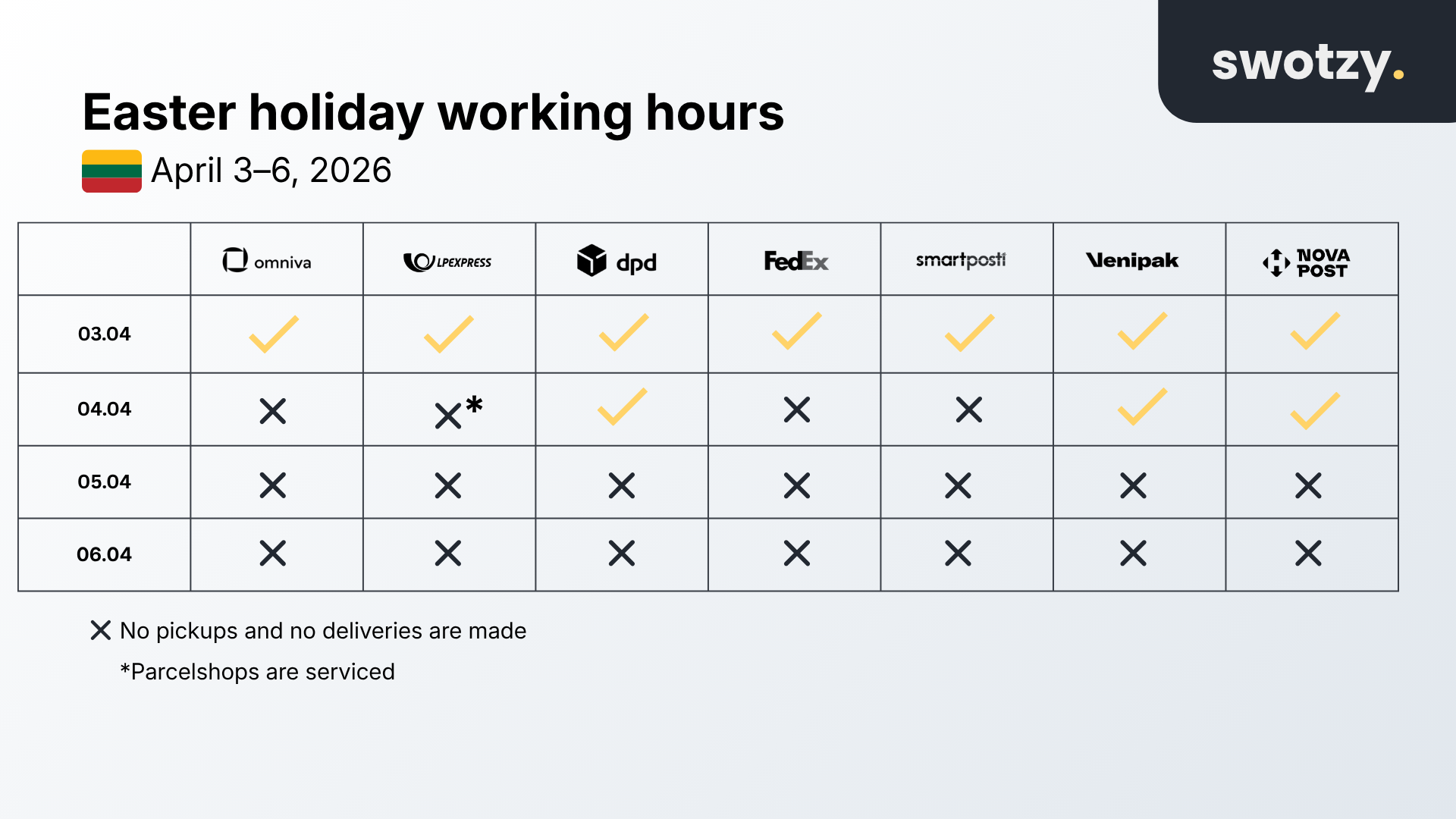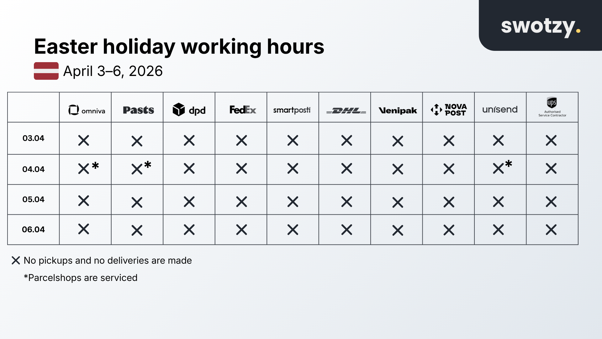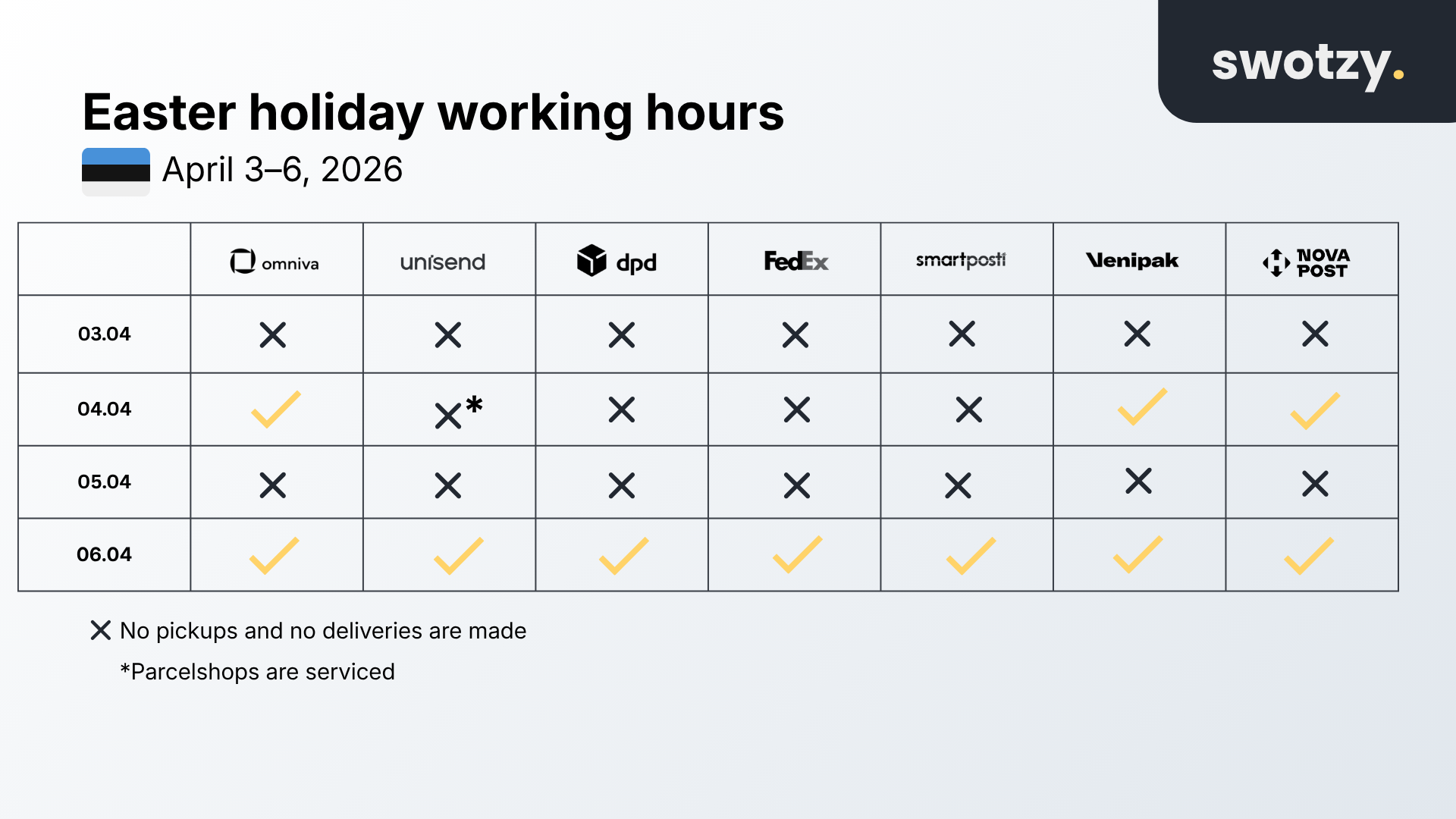 A separate update with Easter holiday working hours for Swotzy and all carriers will follow shortly.